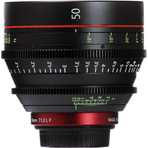Canon CNE 50mm T1.3 L F Cine Lens is an EF-mount standard-width lens for Canon’s C-series cinema cameras, full-frame EOS DSLRs, and any video-capable camera that accepts EF-mount lenses. The aperture is a fast T1.3 that lets you get superior shots in low light. The diaphragm is made up of 11-blades and is as round as can be, and along with the fast aperture it can produce impressive bokeh and beautiful circular highlights. The diaphragm ring is stepless, super-smooth, and fully manual, even when used with a DSLR, offering an evermore accurate handle.